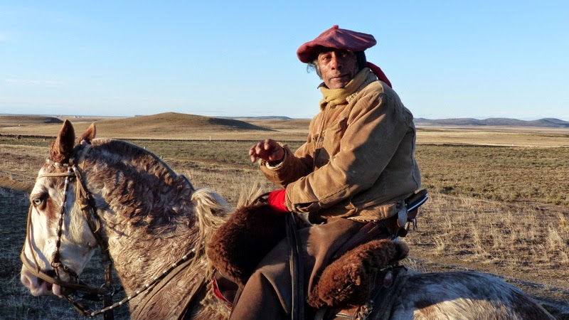 L’incontro con un gaucho a cavallo  e’ cio’ che ci vuole per ben iniziare la giornata. Per lui il freddo non e’ ancora arrivato e se ne va in groppa al suo destriero verso la mandria che , pigra, lo attende al pascolo.
