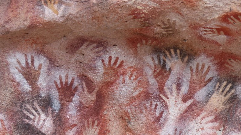 Optiamo per la ruta nuova , un saliscendi per le montagne con ripio a tratti fangoso e a tratti con neve dei giorni passati e ghiaccio. Ma la superiamo marciando con cautela. Arriviamo alla Cueva de las Manos: oltre a  pitture rupestri rappresentanti scene di caccia e di vita quotidiana, quel che piu’ affascina sono le centinaia di impronte di mani impresse per sempre sulle rocce dagli abitanti di quel luogo remoto , utilizzando come colore  una mistura  di pigmenti minerali, vegetali ed organici, soffiata con la tecnica del negativo. Si stima che risalgano a 9000 anni fa, sino alle piu’ recenti, di 3000 anni fa.