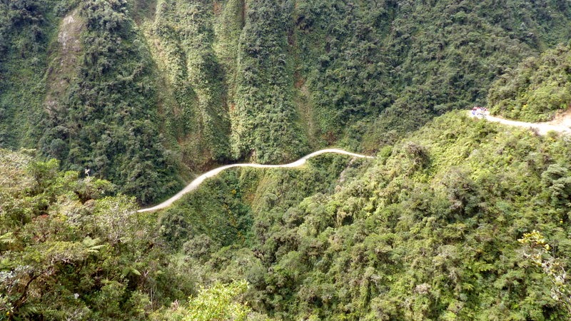 Lasciamo il caos chiassoso di La Paz e ci dirigiamo verso la selvaggia e verdissima Nor Yungas. Saliamo sino a 4650 mt sfiorando le nuvole che lentamente salgono svelando le cime e i pendii di rigogliose montagne. Alcune lagune occhieggiano piu’ in basso. Ed ecco il cartello che segnala l’ingresso alla mitica Carretera de la Muerte che noi, senza esitare, imbocchiamo , lasciando l’asfalto della nuova strada che consente oggi ai mezzi pesanti e veicoli in genere, di collegare la capitale con le altre citta’ vicine, senza piu’ percorrere l’angusto sentiero di terra e pietra a ridosso del monte da un lato e a strapiombo dall’altro. Oggi, infatti, e’ destinata soltanto alle discese di gruppi organizzati di bikers e a “pazzi” che come noi non vogliono privarsi dell’ebbrezza di percorrere questa tanto temuta, ma altrettanto, affascinante “strada” di soli tre metri di larghezza che si aggrappa ai fianchi di montagne fitte di vegetazione tropicale, restando in bilico sul vuoto per oltre una quarantina di chilometri.