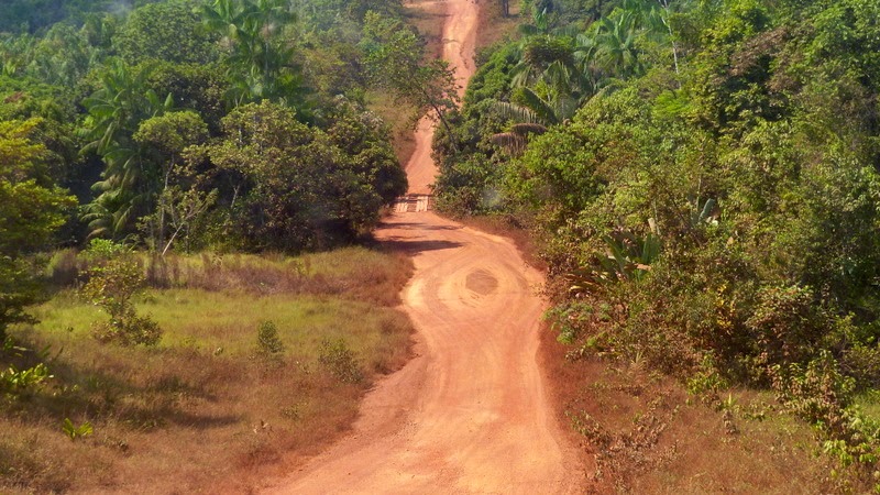 Cosi’ ,giovedi 09 ottobre alle 14, 00, ci scaricano su di una sponda vicino ad una segheria, imbocchiamo una pista di terra rossa che si insinua nel fitto della foresta amazzonica, indicataci dai locali in quanto non vi e’ traccia nelle nostre cartografie. Al nostro passaggio, saltano in fuga da un ramo all’altro, alcuni macachi. Il caldo e’ opprimente anche se il sole fatica ad entrare, tanta e’ folta la vegetazione e l’umidita’ e’ tale che se ne percepisce l’odore. Le acque fresche di un rio ci invitano ad un bagno ristoratore e ad una sosta per la notte. Ripartiamo la mattina all’alba: ci aspetteranno altri due giorni di pista polverosa a tratti disseminata di buche e solchi creati dal flusso copioso delle piogge, di saliscendi tra la foresta,