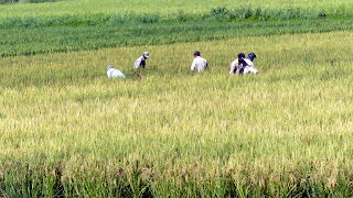 Dopo piu’ di due ore, lasciamo la dogana diretti verso il nord del Paese. La strada e’ asfaltata, la guida sempre a sinistra ed i primi villaggi che si incontrano ci appaiono caotici e trascurati. La gente non accenna sorrisi o saluti al nostro passaggio, ma sguardi duri e diffidenti. Man mano che ci allontaniamo dal confine, pero’ , i villaggi si colorano, i volti cambiano e l’ospitalità aumenta. Notiamo anche qui la mescolanza di piu’ popoli: cinesi, amerindi, africani, europei ma soprattutto indiani, la cui cultura si percepisce anche nella cucina piccante e speziata. L’agricoltura e’ l’attivita’ principale e ci si accorge subito che la produzione del riso e’ predominante: verdi risaie a perdita d’occhio confinano con la strada principale che percorriamo e sono numerosi i camion carichi di riso gia’  raccolto che in colonna aspettano pazientemente di scaricarlo nelle molteplici aziende agricole che si incontrano.