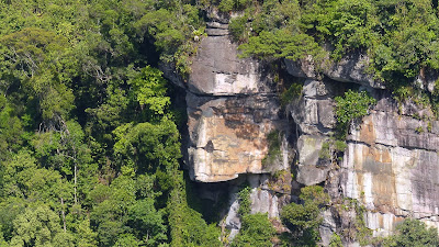 Motori alla massima potenza e …..via, decolliamo. Sotto di noi, abbandonata la vista della citta’ , solo una verde distesa di foresta fittissima, solcata da corsi d’acqua serpeggianti e dal grande Essequibo River, nelle cui acque sfocia il fiume Potaro. Sorvoliamo le miniere d’oro e di diamanti, grande ricchezza, assieme alla bauxite, della Guyana. L’aereo sussulta non poco entrando nelle nuvole e il paesaggio sottostante scompare nella nebbia. Riappare da lì a poco , la quota si abbassa e si intravedono le sagome dei tepui, un’ultima virata e alla nostra destra, in tutto il suo splendore ci appare l’imponente Kaieteur Falls,