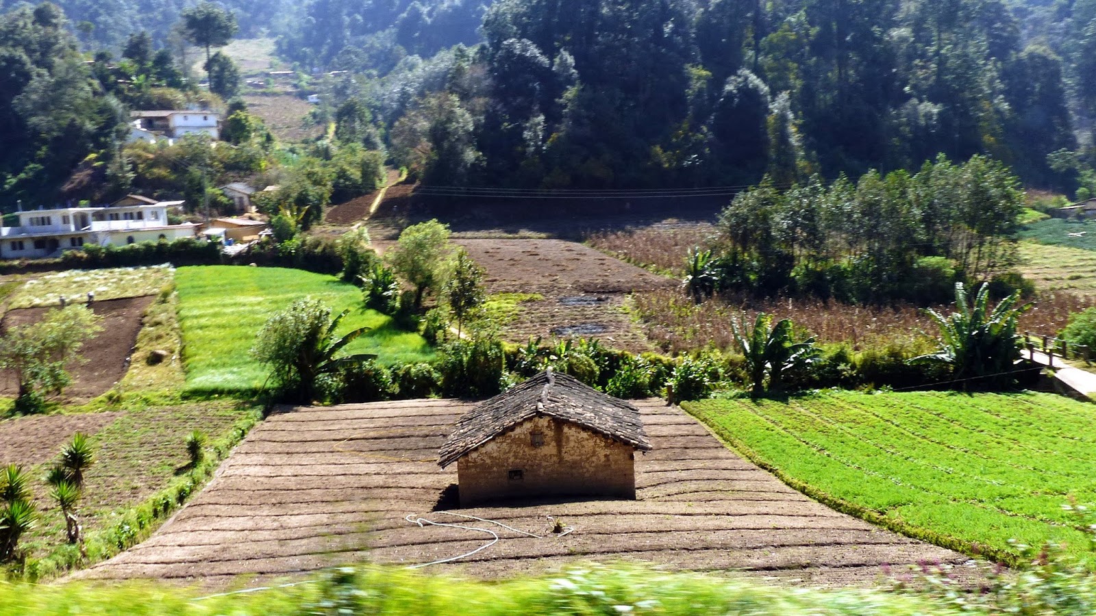 I villaggi si susseguono ai bordi della strada che corre in quota: piccole case di terra ocra e legno sventolano variopinti panni ad asciugare; uomini ricurvi su vanghe preparano il terreno alla nuova semina; ordinati campi coltivati ad ortaggi rivestono dolci pendii baciati dal sole e le donne avvolte nei loro tipici abiti indigeni espongono frutta colorata e fresca verdura di stagione nelle bancarelle ai margini della carreggiata. Compaiono le conifere e scompaiono le piante tropicali, si infittiscono i boschi e aumentano i corsi d’acqua.