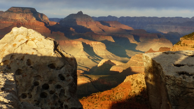 sino a che le ombre si allungano e gli  ultimi raggi del sole riscaldano ed  accendono i colori del Gran Canyon, imponente , maestoso ed emozionante difronte a noi.