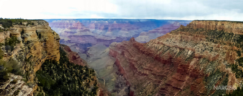 Poi, ci ritroviamo attorniati da folte foreste, quando entriamo nel Gran Canyon National Park che si estende per quasi 5000 kmq nello Stato dell’Arizona. Marciamo su di una via lambita da contorti ginepri dello Utah, pini “pignoni” , arbusti profumati, cactus bassi ed insidiosi, che nulla trapelano di ciò che di lì a poco si aprirà ai nostri occhi. Giriamo lo sguardo e tratteniamo il respiro e a stento le lacrime, alla vista del mitico