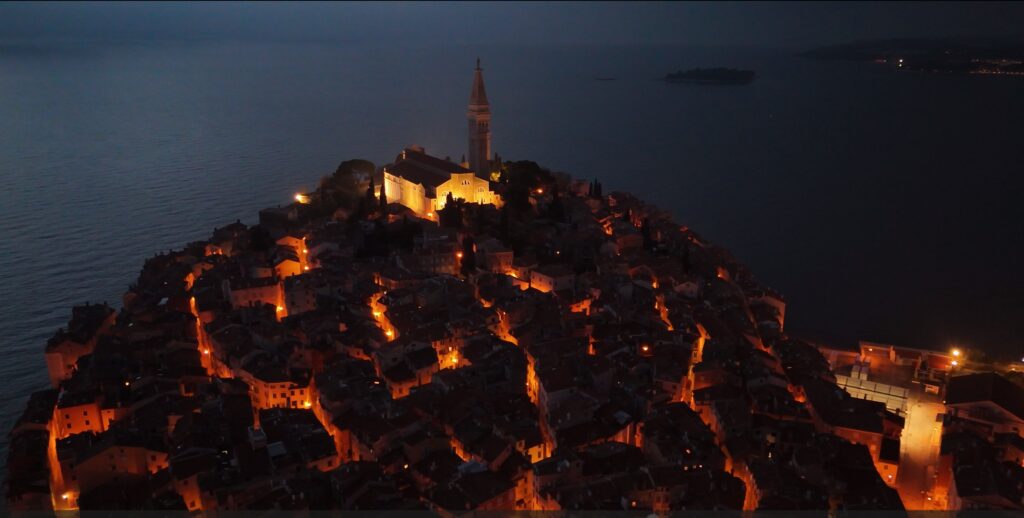 e riprendiamo la marcia in direzione Rovigno. Vi arriviamo nelle prime ore del pomeriggio; parcheggiati nelle vicinanze della città vecchia, ci incamminiamo per raggiungerla. Costeggiata dal mare, iniziamo a salire le strette vie lastricate al suo interno che si snodano sino ad arrivare al punto più alto del borgo dove sorge la chiesa di Santa Eufemia, da cui si può godere della vista sulla baia sottostante e sulla città che poco a poco si illumina. Le luci si accendono ed il sole inizia a calare, un ultimo sguardo all’orizzonte e scendiamo anche noi , solitario in questo borgo deserto fuori stagione. Il porticciolo accoglie piccole barche colorate e tutt’intorno i lampioni accesi incorniciano la piazzetta. Arriviamo ormai col buio da Narciso che ci aspetta anch’esso solitario nel piazzale.