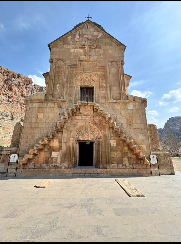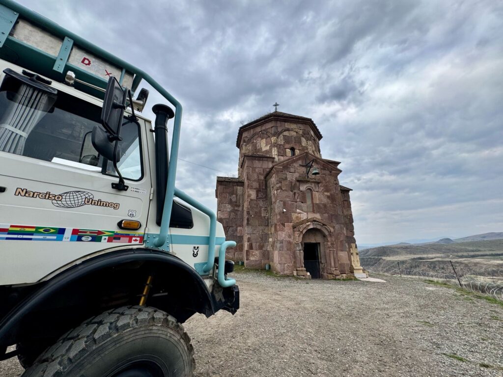Ripartiamo la mattina seguente, ma solo dopo 20 km si romperanno di nuovo. Decidiamo quindi di sostituirli con un paio di scorta e proseguire verso la capitale dove potremo ricevere i nuovi ammortizzatori dall’Italia. Ma prima, un salto al cimitero di Noratus, 7 ettari di terreno ricoperto da migliaia di sepolcri e il più gran numero di steli (khachkar) presente nel paese, datate tra il IX e XVII secolo. Procediamo per montagne, cave di basalto e altopiani innevati, percorrendo un tratto della Silk Road sino al caravanserraglio sul passo Selim a m.2400 slm., uno dei meglio conservati che offriva vitto, alloggio e possibilità di scambi commerciali, agli inizi del 1300. Scendiamo per la notte e ci rifugiamo in un piccolo paese quasi a valle, vicino ad un produttore di mattoni di letame Il 30 marzo ripartiamo alla volta del monastero di Noravank che raggiungiamo attraversando un canyon di pareti rocciose verticali infuocate e alcuni tornanti che ci conducono in cima al sito medioevale di architettura armena, in cui spicca la chiesa a due piani de la Santa Madre di Dio, il cui piano superiore si raggiunge tramite una ripidissima scala in pietra esterna alla facciata.