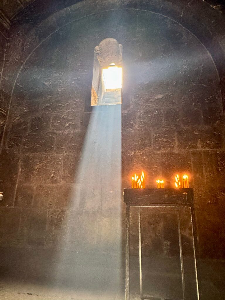 Procediamo e la sera arriviamo a Dilijan , una graziosa cittadina circondata da verdi foreste. L’indomani visitiamo nei pressi il Monastero di Haghartsin, raggiunto dopo aver percorso una strada in salita tra boschi ancora spogli. Il monastero, datato tra il X ed il XIII secolo, è composto da tre chiese, San Gregorio, Santo Stefano e Santa Maria, da un gavit (una sorta di atrio) ed un refettorio ampio e ben conservato. Le chiese al loro interno sono buie e suggestive, rischiarate dal solo fascio di luce che entra dalle piccole finestre in cima, creando un’atmosfera mistica e contemplativa, di pace e serenità.